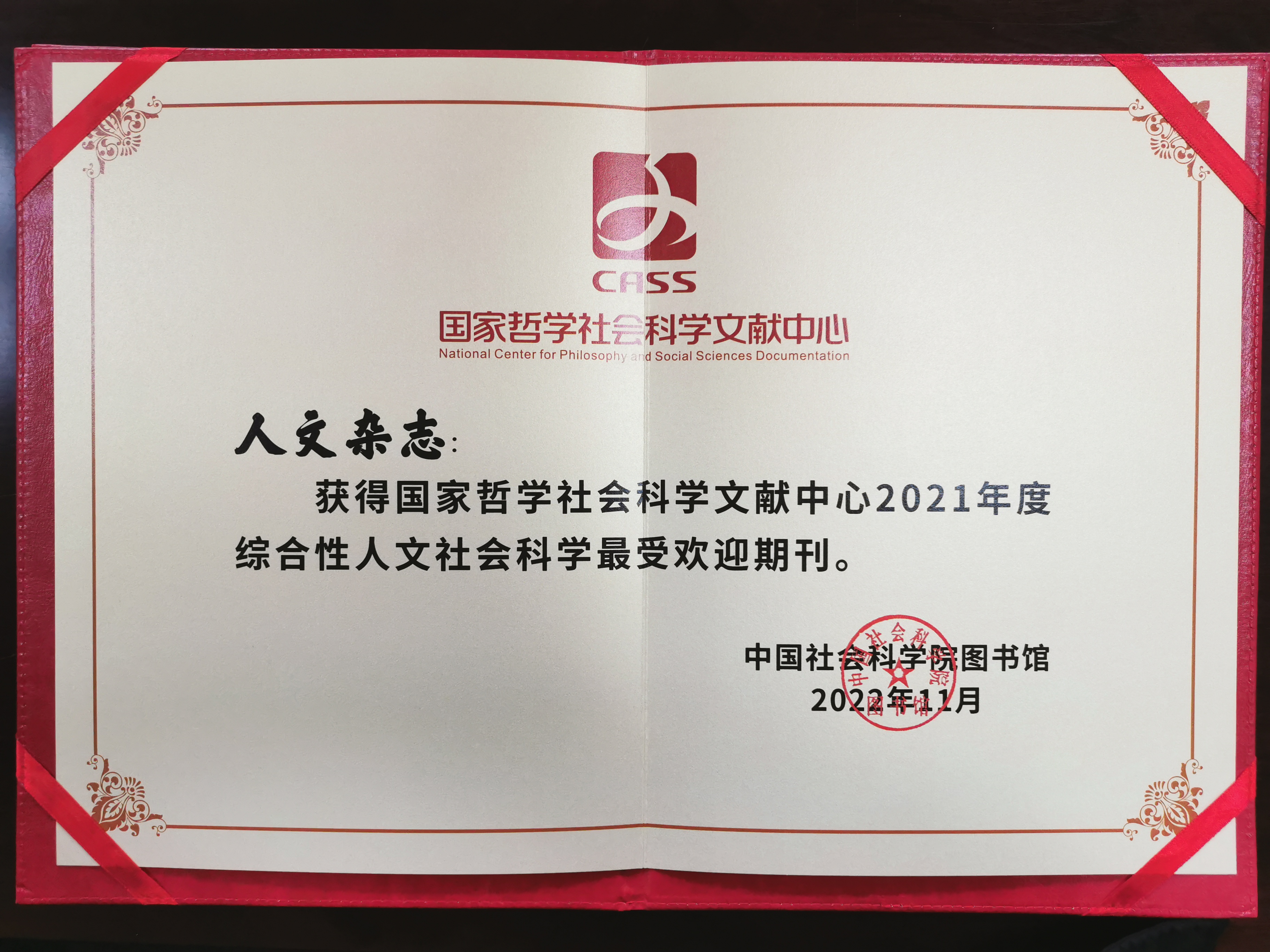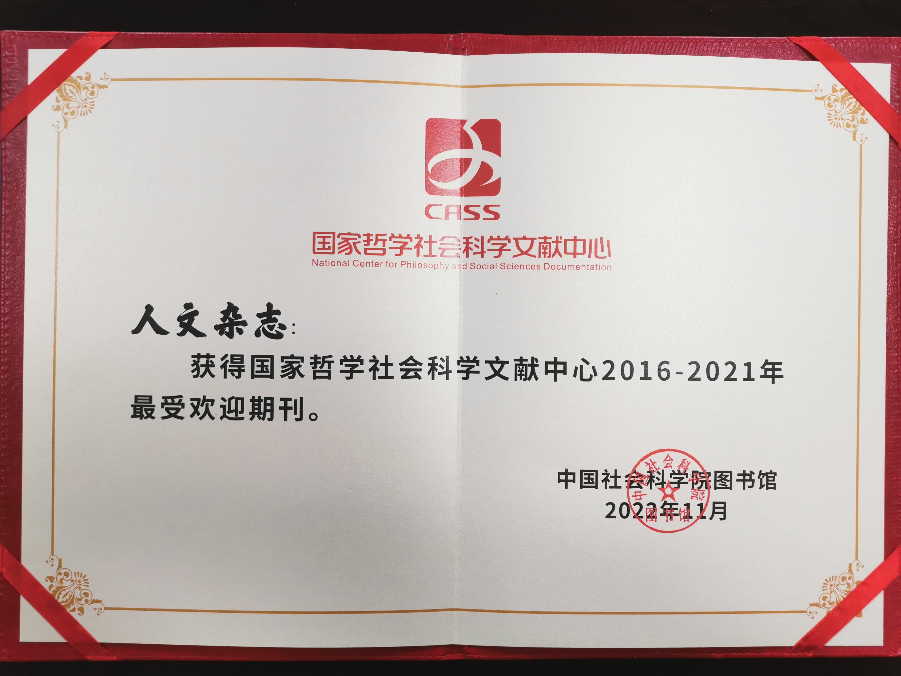 近日,国家哲学社会科学文献中心发布《国家哲学社会科学文献中心建设成果报告(2016—2022年)》和《国家哲学社会科学文献中心中文期刊用户关注度报告(2021年度)》,《人文杂志》荣获“国家哲学社会科学文献中心2016—2021年最受欢迎期刊”和“2021年度综合性人文社会科学最受欢迎期刊”两项荣誉。这是我刊继2021年获评“国家哲学社会科学文献中心2016—2020年最受欢迎期刊”和“2020年度综合性人文社会科学最受欢迎期刊”之后,再次获得“最受欢迎期刊”荣誉。