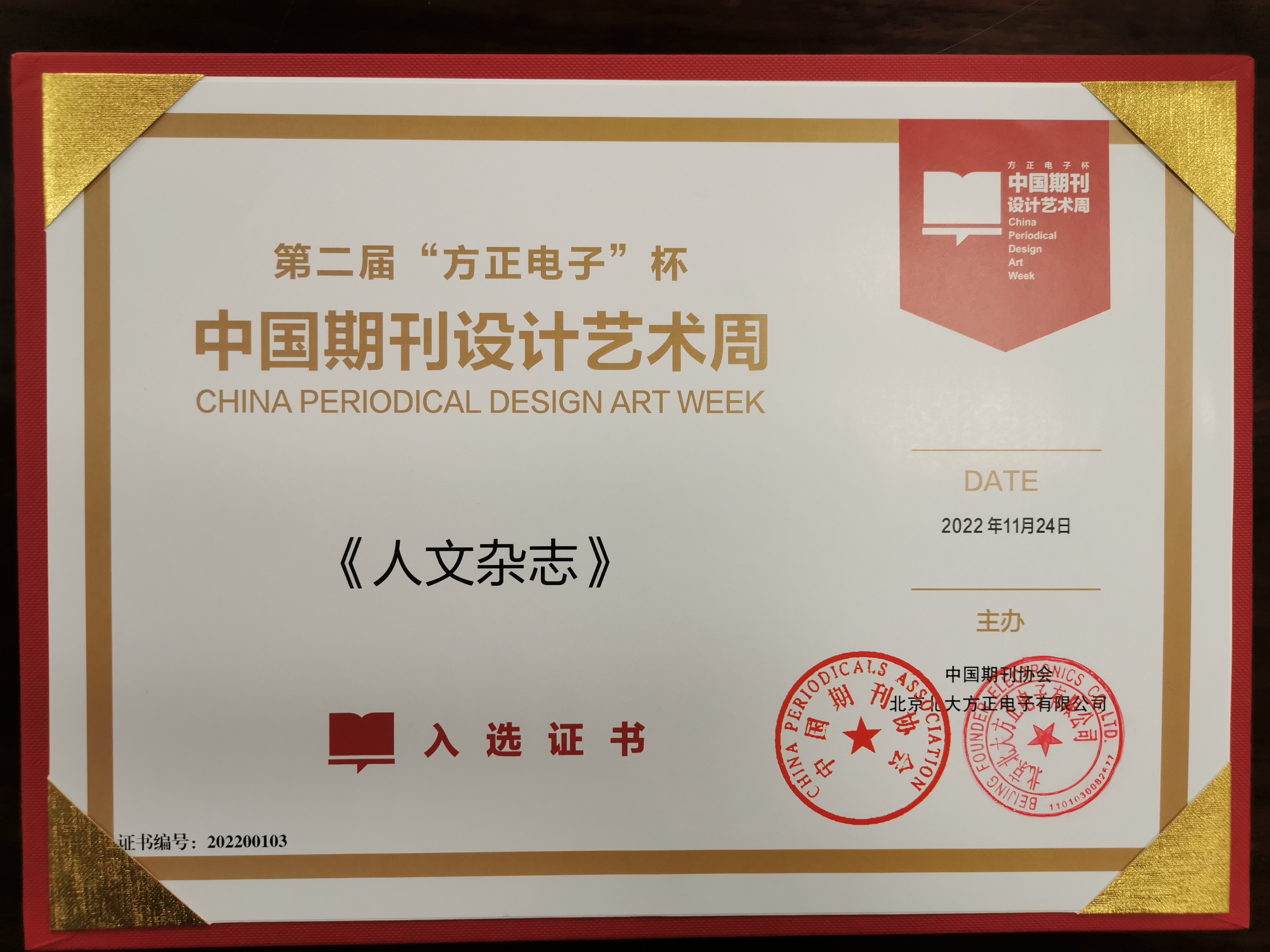 此外,在中国期刊协会、北京北大方正电子有限公司主办的第二届“方正电子”杯中国期刊设计艺术周中,《人文杂志》获得入选期刊荣誉。同时,在中国期刊协会主办的北京国际图书博览会(BIBF)上,《人文杂志》入选“2022中国精品期刊展”。